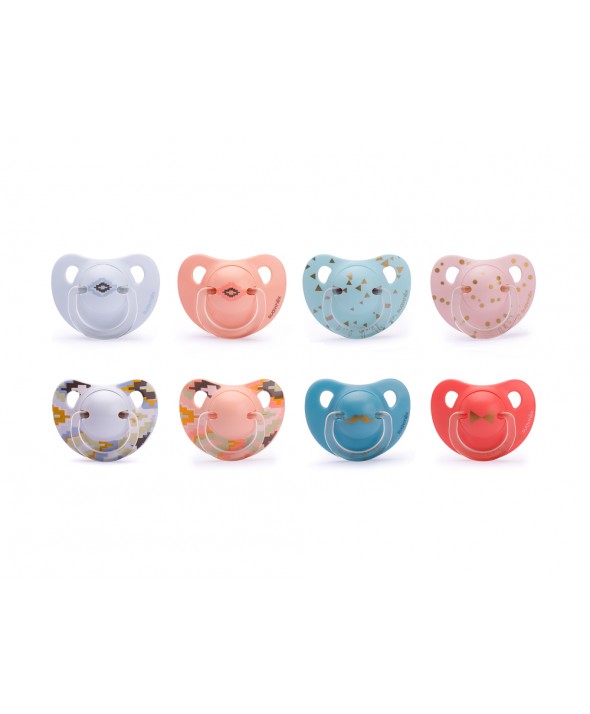 El Suavinex chupete con tetina anatómica de látex está diseñado para imitar la forma del pezón materno durante la succión, adaptándose perfectamente al paladar del bebé. Este producto cuenta con la avalación de la Sociedad Española de Odontopediatría y se ofrece en 6 diseños distintos, que son combinables con los broches pinza y los biberones de la colección.